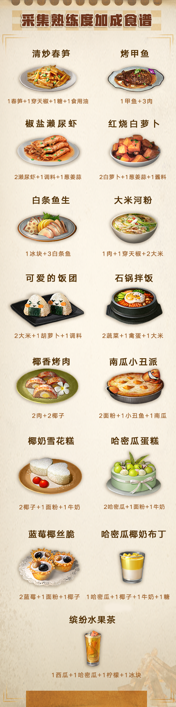 在射击或者采集物资时,不同食物拥有的美味属性,也可以暂时提升自身的采集或战斗熟练度获取效率。