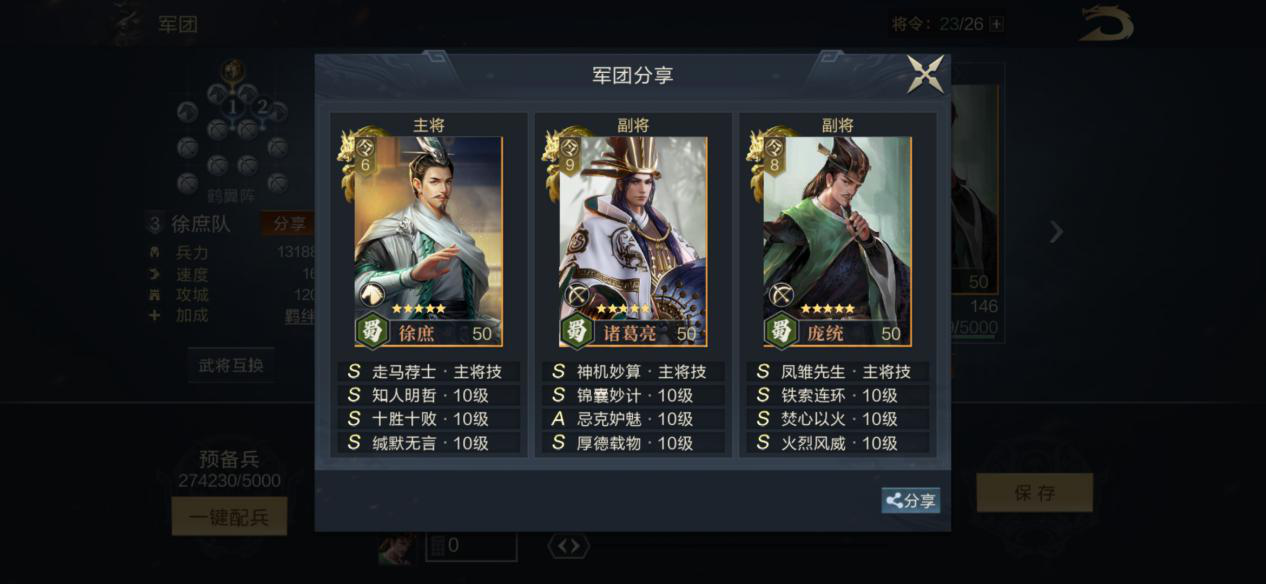 徐庶加上诸葛亮和庞统的队伍,是标准的蜀国智力队,以智力爆发伤害为主。选取徐庶作为主将,是因为其主将技走马荐士有着强力净化效果,同时,10%主动技释放概率增加,对于智力队尤为关键。同时,知人明哲还能增加徐庶的生存能力。在携带技能上,徐庶可以选择辅助或控制类武技。例如S级武技十胜十败,能够净化友军武将的负面状态,同时驱散敌方武将的正面状态,还能造成伤害,攻守兼备。同时,还可以携带缄默无言,保证徐庶能够开出净化效果。