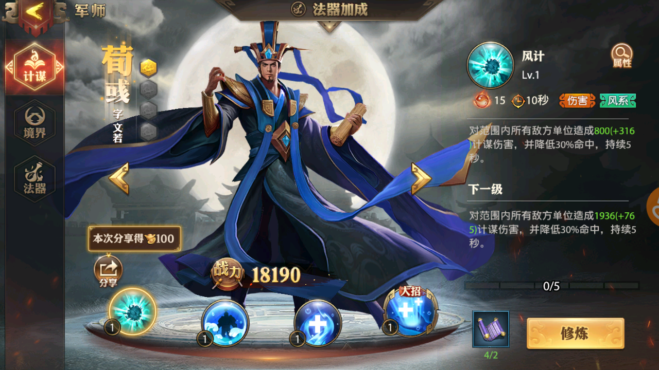 恢复专精型。基础技能分别是风系减益、水系护盾、水系回复,大招是水系回复,发起技能能增强盾兵部队生存。荀彧主要用来加强阵容生存能力,提高容错率,在长坂坡、赤壁等玩法中表现不错。军师碎片来源于主线任务、巅峰论战,培养难度相对不高。