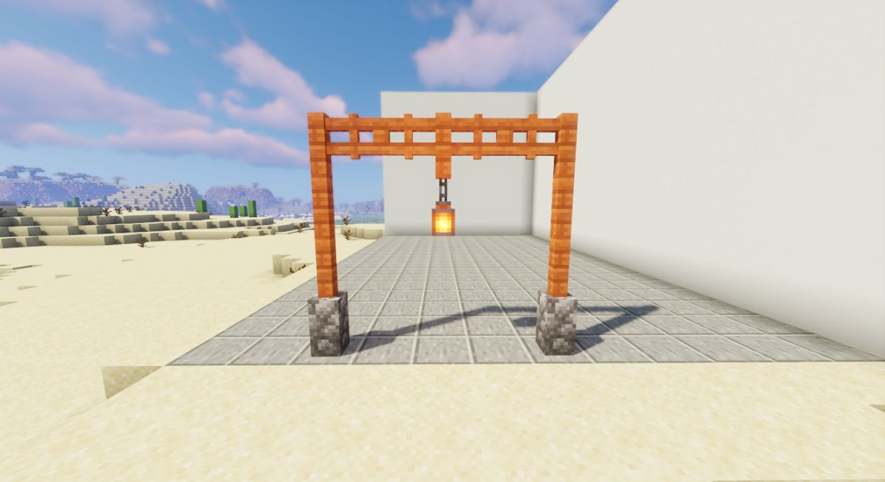 依旧用金合欢栅栏门放在左右,合金欢栅栏放在中间以链接两根柱子。下面可以挂一个灯笼!