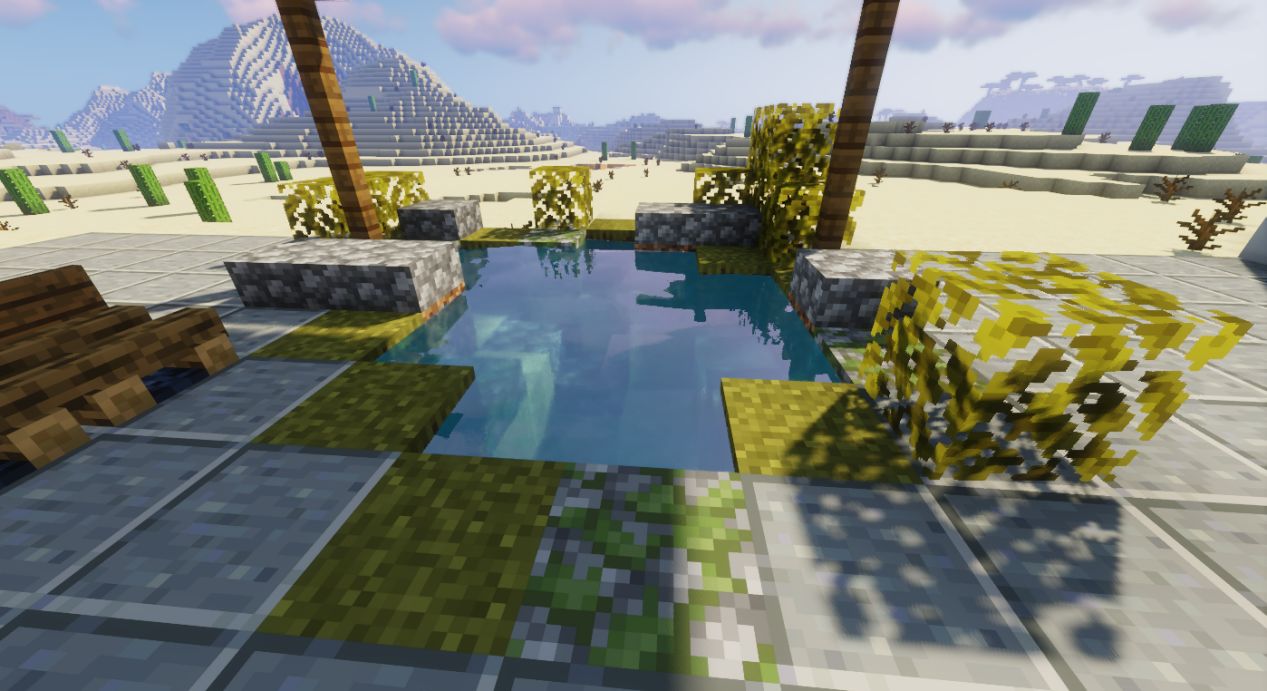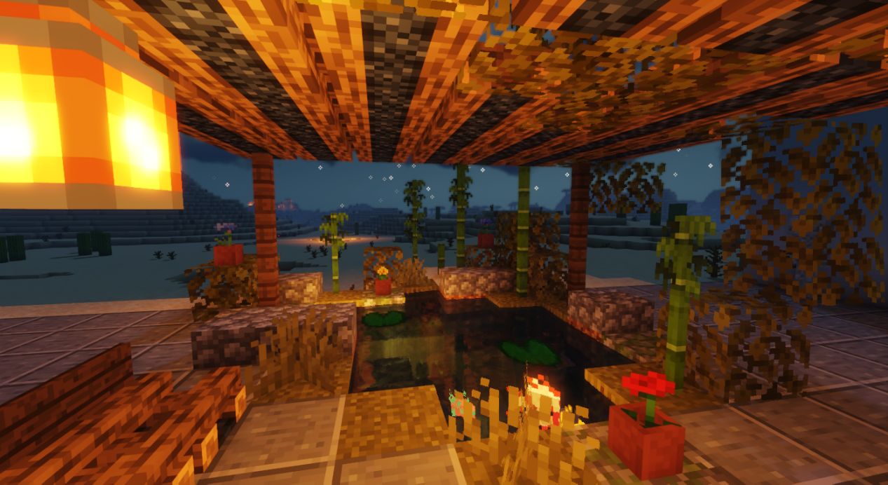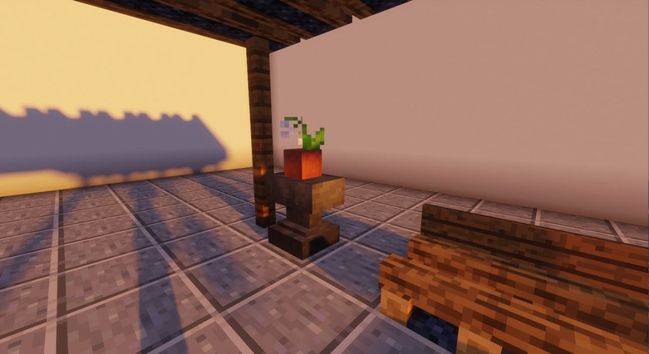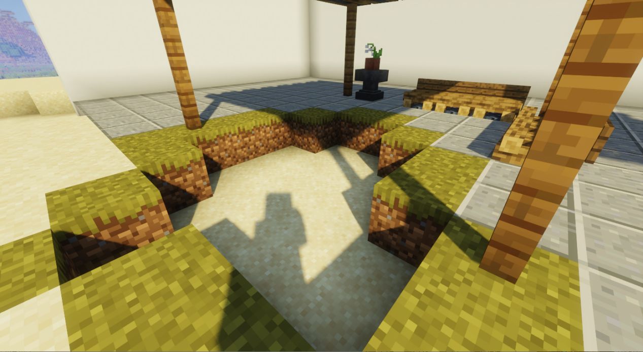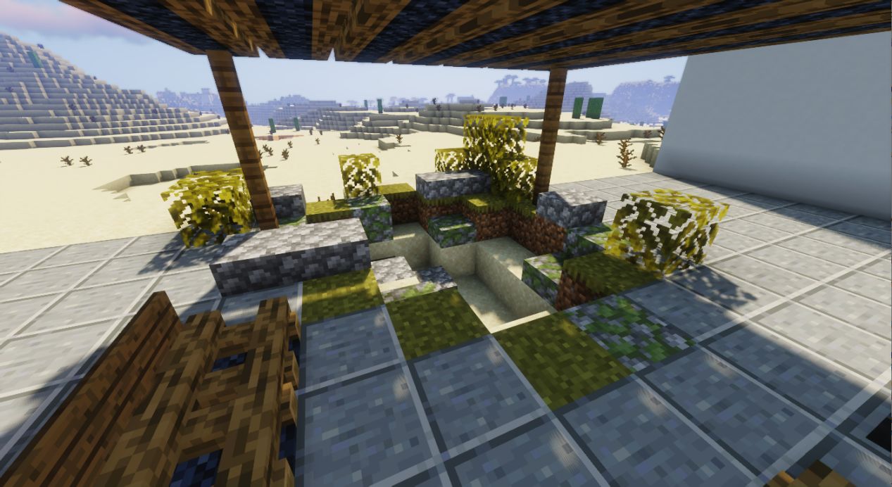 用圆石台阶和苔石台阶修饰内部。边缘也可进行适当修饰。
