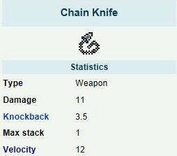 链刀是一种近战武器,可以发射链子另一端的尖锥,但无法持续攻击,最长发射距离12格,速度很快,早期是不错的新手武器。
