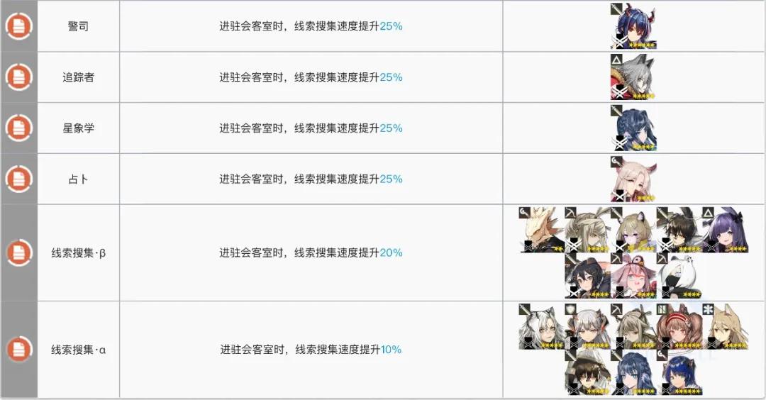 会客室,关系到线索收集,比较复杂的是,干员的星级和精英化级别的提升会影响线索收集的速度。哪怕没有控制中枢中阿和惊蛰的存在,一些本身就有线索收集能力的干员,也会提高对应阵营的线索出现率,需要注意。