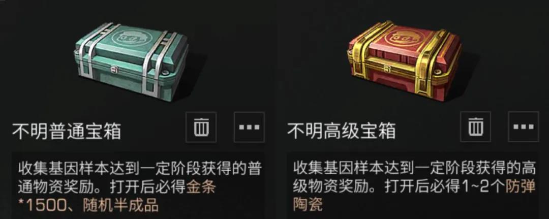开启普通宝箱必获得金条*1500和随机半成品,开启高级宝箱必获得1~2个防弹陶瓷。