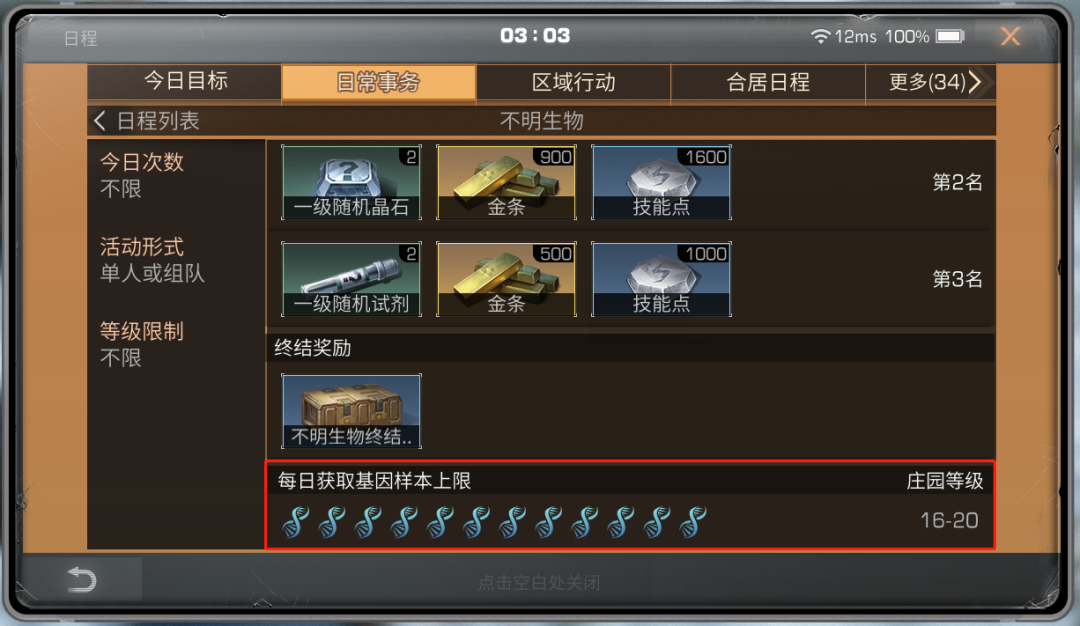 每收集一个基因样本,将获得战斗熟练度与技能点,每日基因样本累计收集达到一定阶段还能获取额外的宝箱奖励。