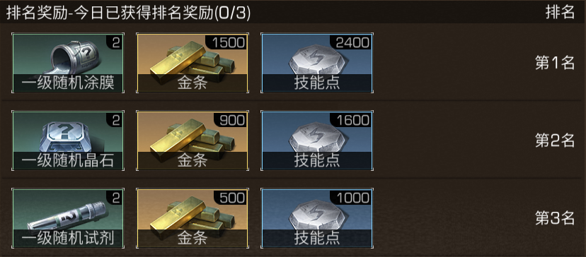 排名奖励有随机涂膜、晶石、试剂、大量金条和技能点,排名越高,奖励越丰厚,排名奖励每日最多获取3次。