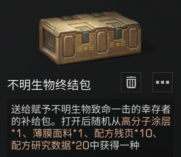 在击败不明生物时,完成最后一击的幸存者将额外获得不明生物终结包,打开后可随机获得以下奖励中的一种: