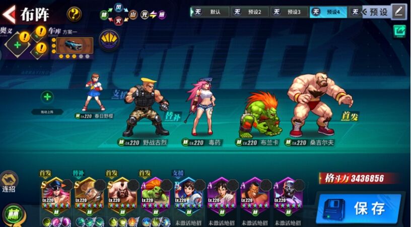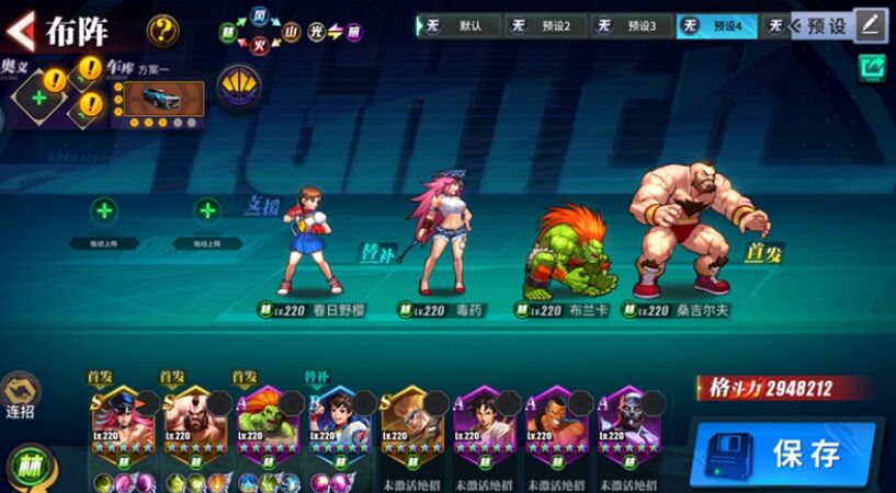 使用这套阵容,可以用毒药的必杀起手,接布兰卡的连招1+毒药或小樱的连招2+桑吉尔夫的连招3。战斗过程中,前期可以主要使用毒药和布兰卡打伤害,需要治疗续航时穿插小樱的技能恢复。