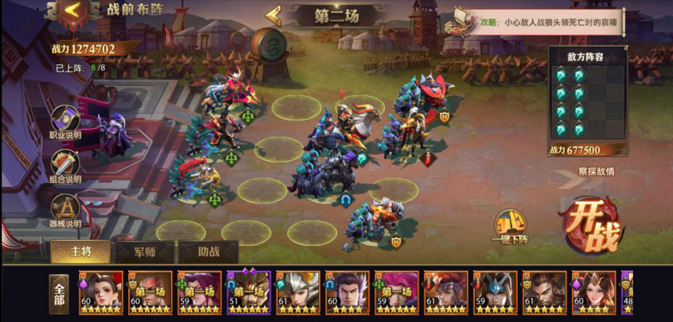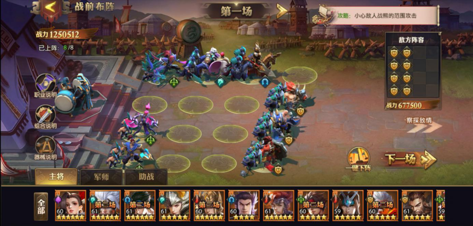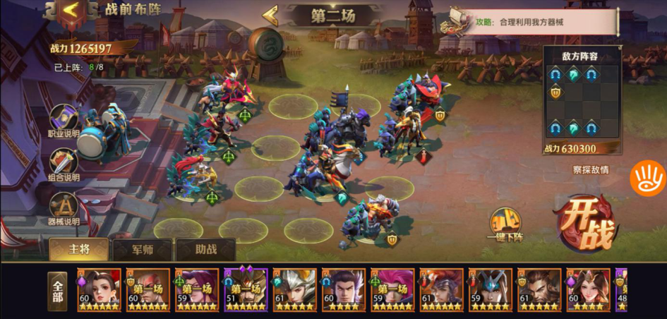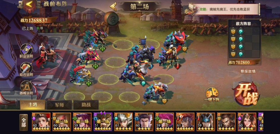 1、对方孟获所在的一条直线上,需要安排最强力的输出,不管是步兵,重骑还是暴力弓手,那一条线上都要有。只有将孟获先击倒,才能削弱对方整体实力。