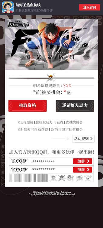 同时,乔小巴还要悄悄告诉大家一个秘密,如果在页面邀请好友参与获得,每成功邀请(被邀请玩家通过分享链接进入)一名玩家参与都可以获得额外一次抽取机会,每位玩家总计最多可获得20次抽取机会哦~快来跟乔小巴一起开启大航海之路的大门吧!