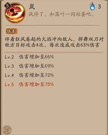 伴着狂风卷起的火焰冲向敌人,挥舞双刀对敌方目标攻击4次,每次造成攻击63%伤害。