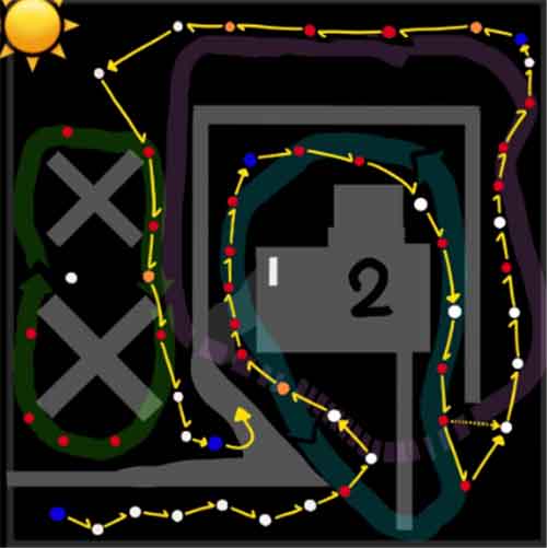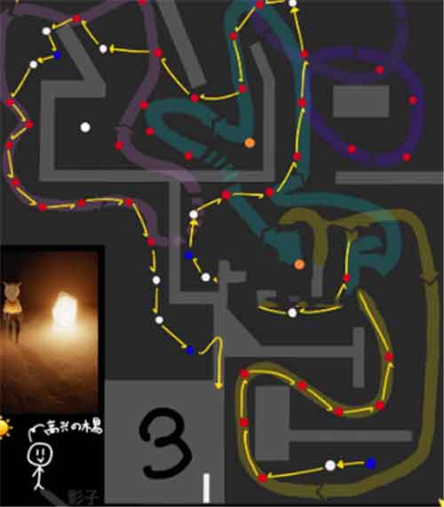 首先火球只能通过【原地停留】的方式躲避,要预先知道前面一个点会出现火球,然后在上一个点多站一会等待火球通过后,就算是躲避掉火球了。下方是火之试炼的路线图,【完整箭头】就是意味这要停留,【半箭头】直接走。