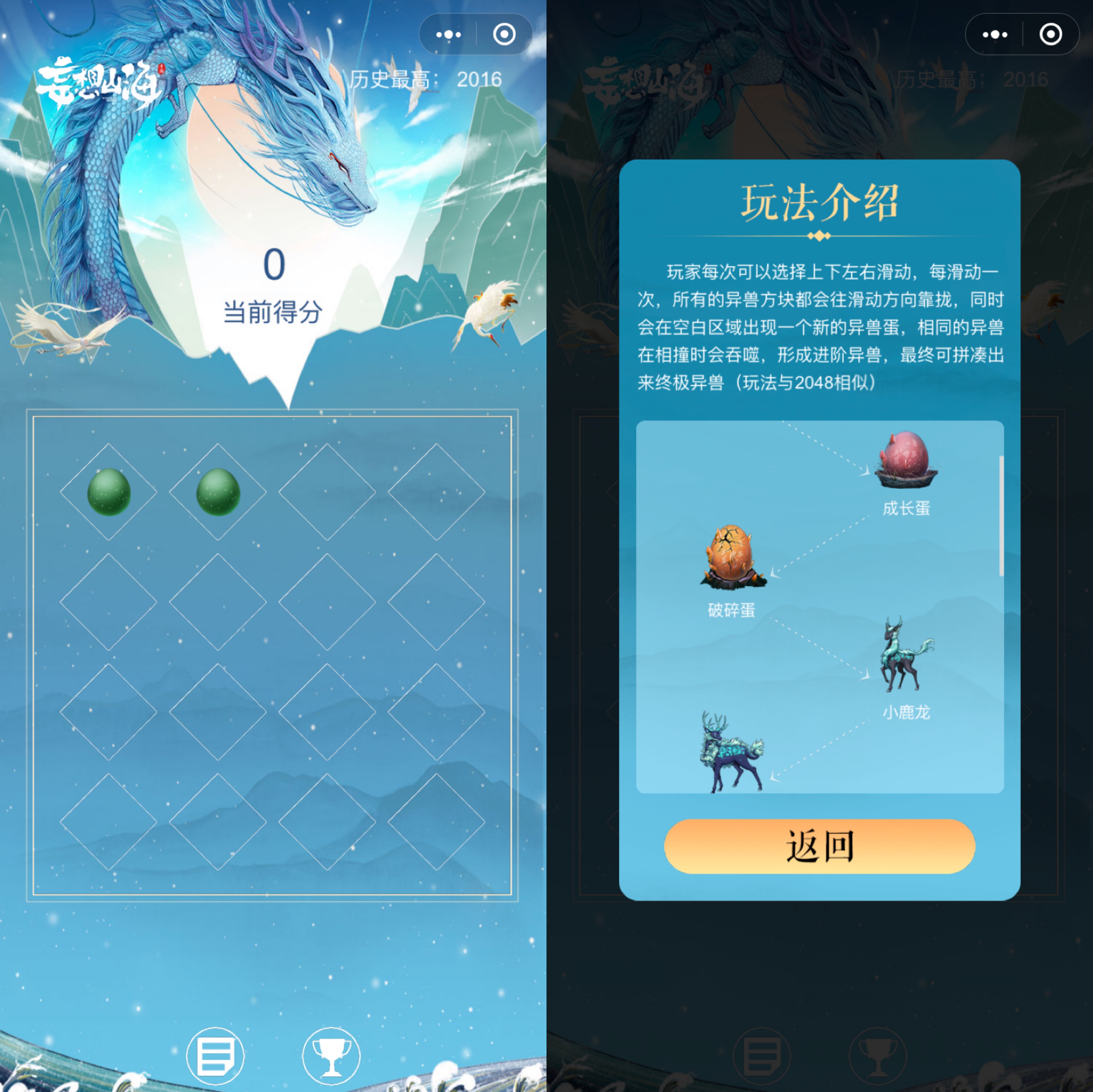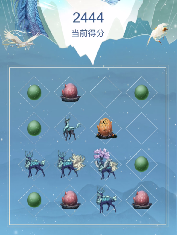 绿色的蛋即是原胎,通过上下左右滑动,当两个同样的蛋相互碰撞吞噬,就能进化出更高级的异兽蛋。注意,移动方向上的每一行,或者每一列,所有相同异兽都会两两吞噬,可以打出combo效果,获得更多得分!