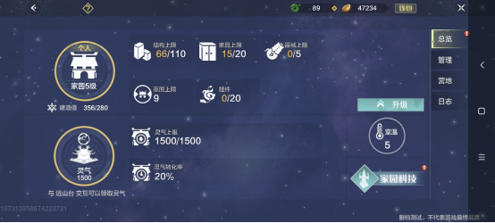 紧挨着家园的,是我们的灵气值,这个灵气值也就是咱们的经验值,当玩家解锁灵器,远山台的时候,通过纳灵功能来获取储存的灵气,灵气随着时间进行恢复(PS:各位旅者记得及时领取,别浪费了哦)