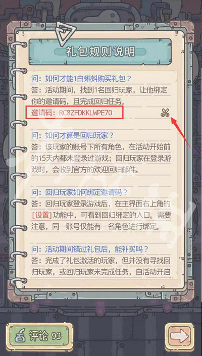 4、在礼包规则中即可查看自己的邀请码,点击标注位置的剪刀即可复制邀请码。