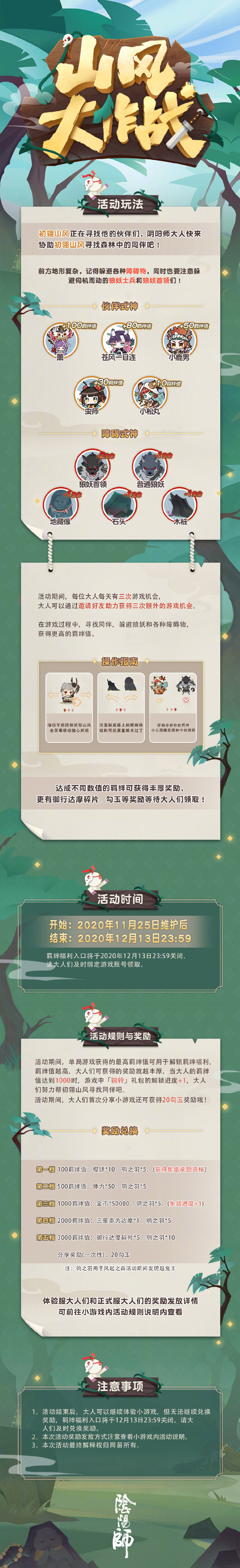 1.活动时间:2020年11月25日维护后-2020年12月13日23:59,活动结束后,排行榜将会保留,大人可以继续体验小游戏。