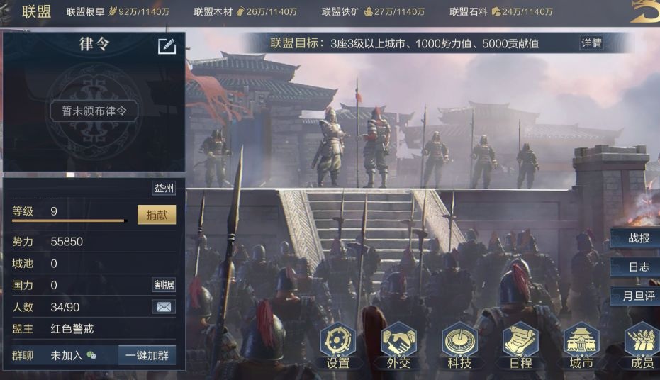 二、玩家们捐献资源获得一定的捐献值,资源主要作用是升级联盟科技,从武将的属性值到城建速度值等等都有。升级科技需要时间,不过这项内容基本属于盟主这种管理层处理的事,其他人资源爆仓的时候记得捐献一下就好。