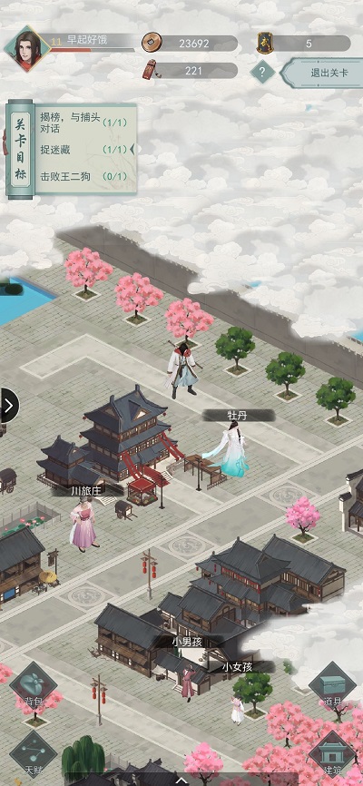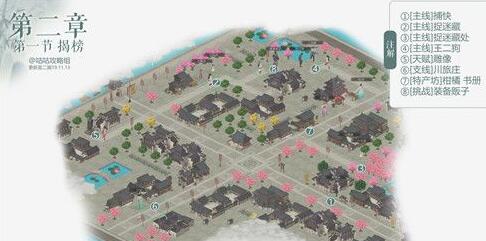 1、玩家在进入关卡之后,沿着小路直走,途中能看见谢捕头和他身边的一块木板,玩家在木板前揭榜,然后与捕头完成对话。
