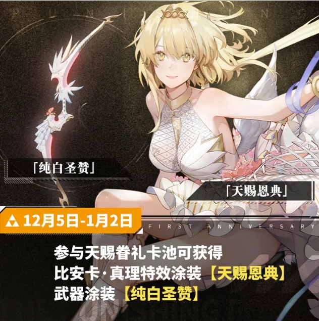 指挥官可在【采购】中购买【圣灵颂歌】,用于天赐眷礼研发池中抽取奖励,每10回研发必定获得1个特殊奖励,其中包括比安卡真理特效涂装【天赐恩典】,指挥官头像【天赐恩典】,武器涂装【纯白圣赞】,武器狙击研发券*2500及活动角色研发券*2500等。
