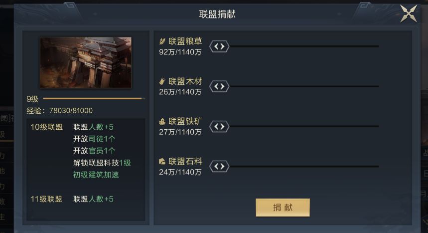 点开联盟首页,右上角联盟名称的下方能看到一个经验条和捐献,点击捐献可以把自己多余的资源全部捐给联盟。
