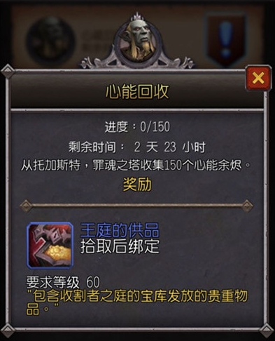 今天周一,有许多玩家刷出了一项新的日常任务是心能回收,要求玩家从托加斯特罪魂之塔收集150个心能余烬。