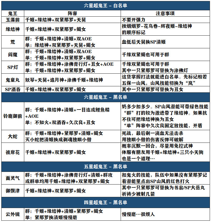 如果不为追求爆肝收益,碰到黑名单超鬼王,可以直接跳过不打。打的话下方表格也给出了阵容解法。大家可以直接存下来随用随查,属性配置上参考第三部分即可