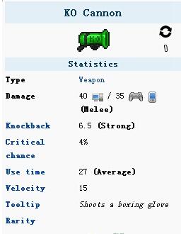 射出一个拳击手套,无视重力,和其他连枷类不一样的一点,自带连发,距离为17个格,尽管和鱼叉比有较短的范围,但击退较强,KO炮没有冷却时间,因此其自动发射速率仅取决于其撞击的距离。