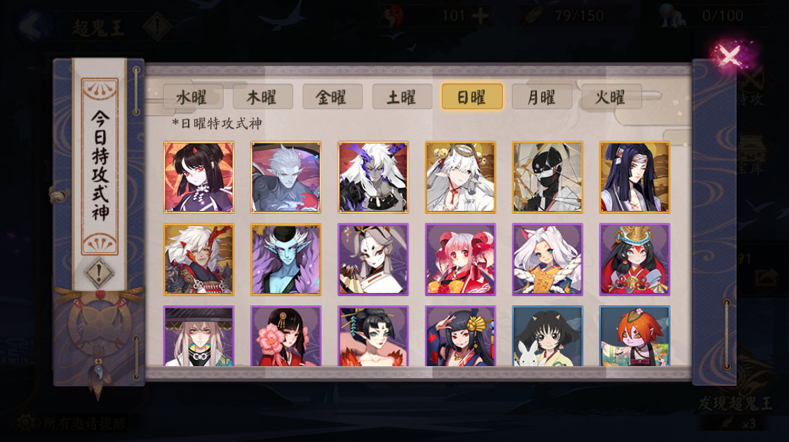 5. 水、日、金、木、土、月、火对应不同系式神攻防提高20%。照着自己阵容式神点出来即可,不知道哪个式神对应什么分类,就从首页-超鬼王-特攻进去查看