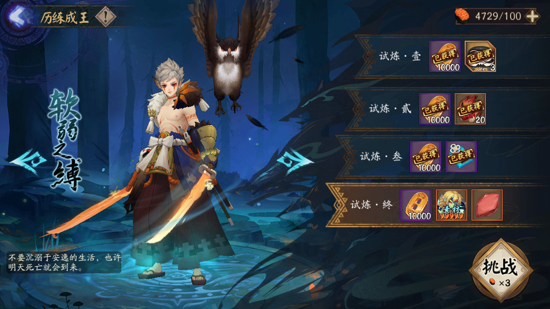 历练是偏福利向的。3分钟内通关就可以拿奖励,奖励只能拿一次。通关历练四个板块的试炼.终后,可以卸除成王玩法中山风的强力技能。