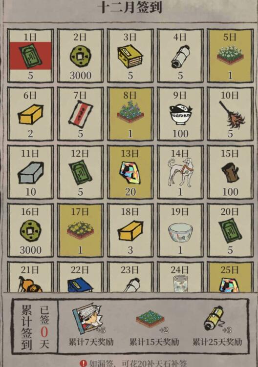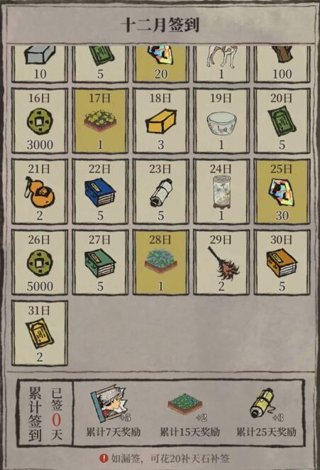 大人们每日签到均能获得奖励,累计签到达到7天、15天、25天还会获得额外好礼。