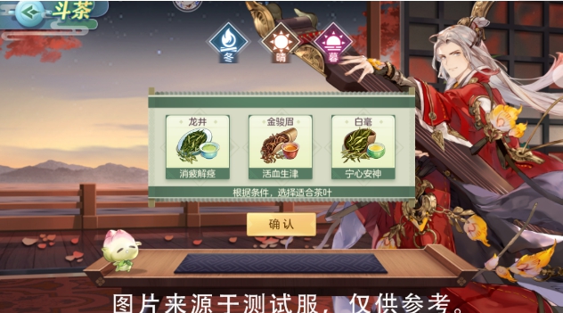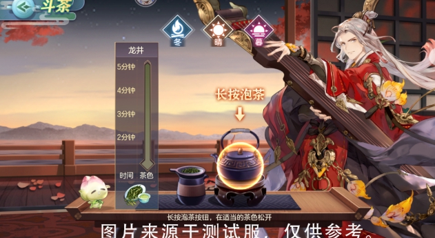 通过判断季节、天气、昼夜等条件因素选择合适的茶品,并通过控制泡茶时间力求为随机武将呈上浓淡相宜的茶品,即可获取评分对应的活动货币「茶晶」与元宝奖励!
