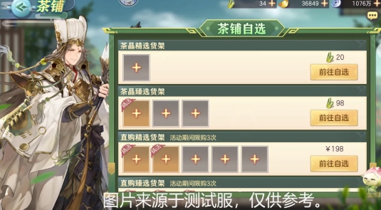 点击茶铺货架中的加号键,即可挑选货架中的精选与普通任选商品,消耗货架标记数量的茶晶或人民币直购后,即可获取选择的商品!超值特惠,不容错过噢!