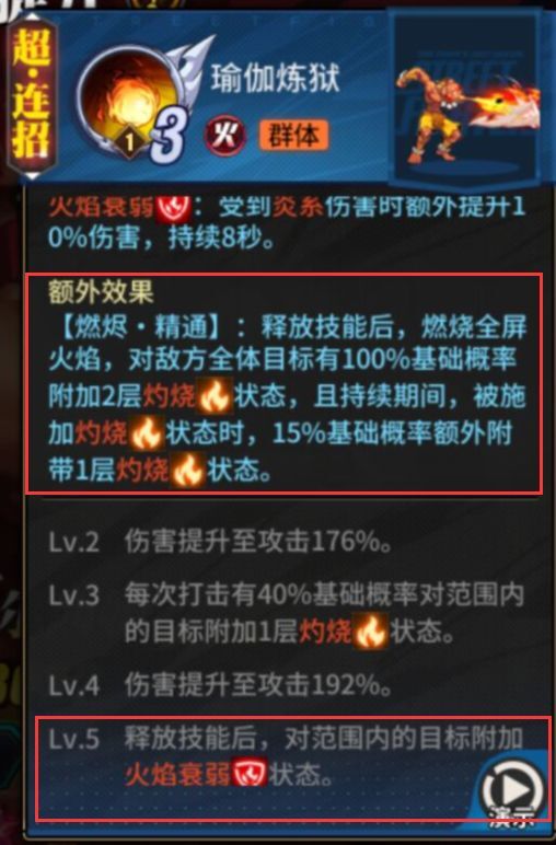 在打完一套以后,敌人身上有非常多的灼烧BUFF以后,第二套以红蛇超连3收尾,高额的燃爆伤害带走前排。