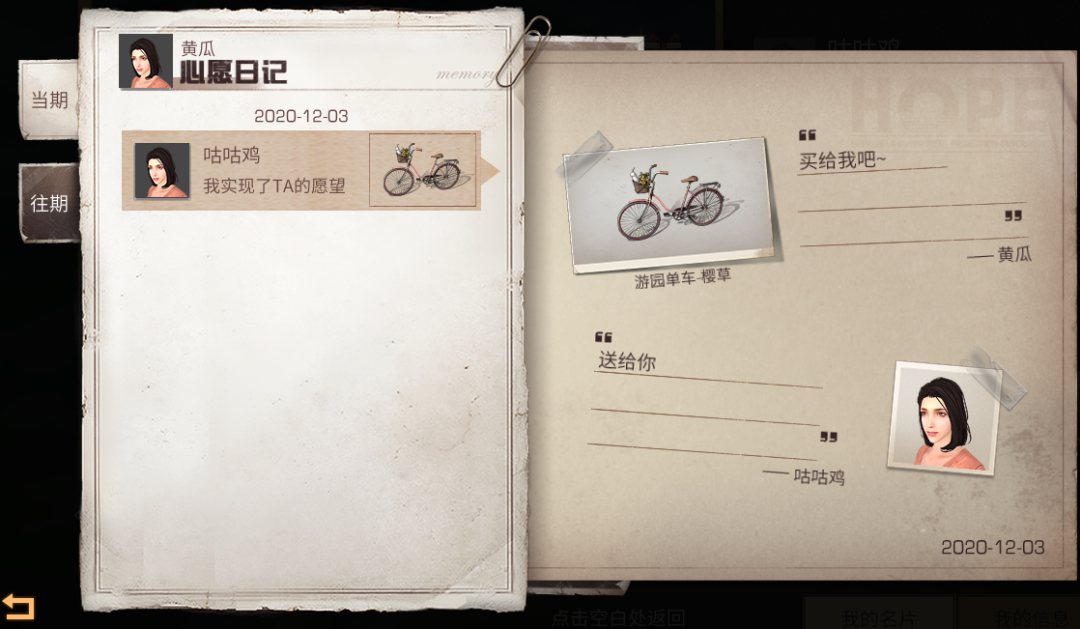 当帮助好友实现愿望亦或是自己愿望实现时,幸存者可以在心愿日记中查看当期及往期许过的心愿情况,一同记录你的心愿清单。