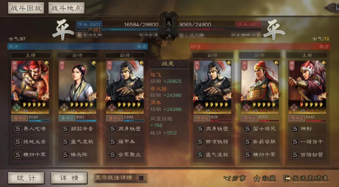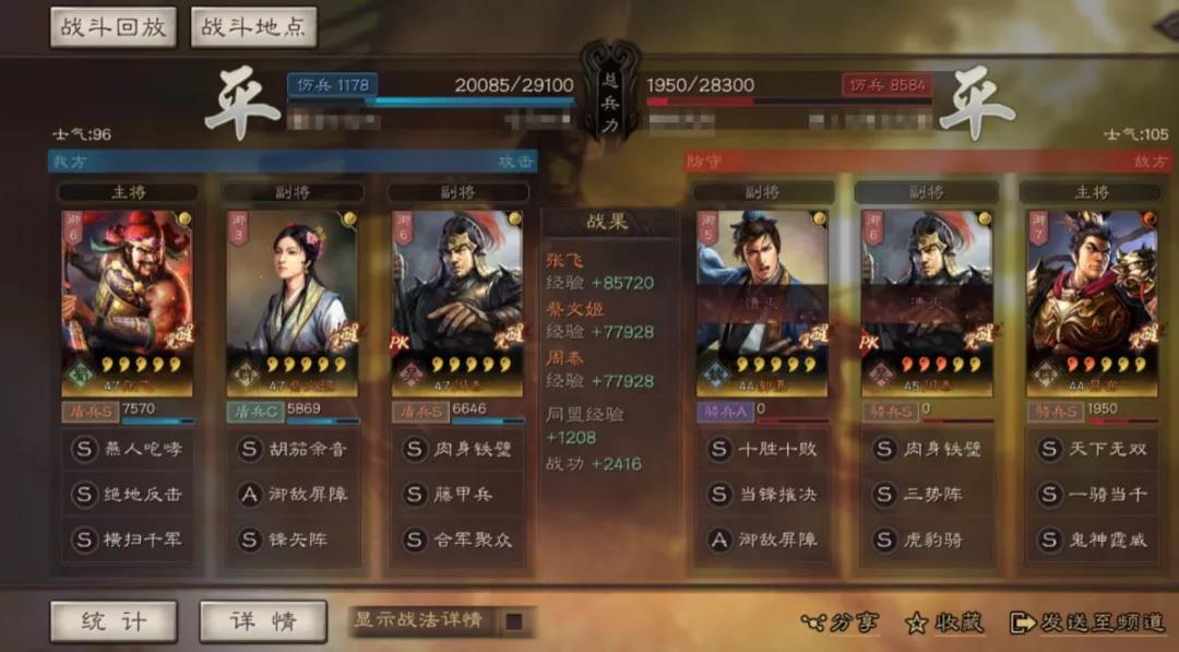 其次是生存问题。得益于藤甲兵,锋失阵全程覆盖的减伤效果,以及蔡文姬胡笳余音发动后带来的减伤效果,作为副将的周泰,蔡文姬可以轻松达到极致的兵刃减伤90%,甚至兵刃减伤溢出。谋略减伤也能轻松达到70%以上。这使得蔡文姬,周泰有着很强的生存能力。只要周泰,蔡文姬还活着,那么周泰就能为张飞承担伤害,蔡文姬能为两者提供减伤与治疗,让张飞保持高兵量,战满八回合。