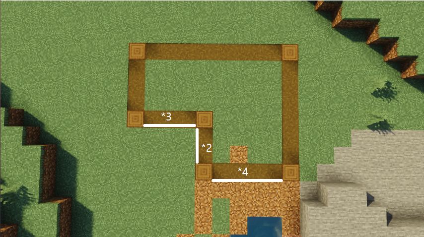 首先,我们如下图所示划好房子的地基,在交点处放置云杉原木: