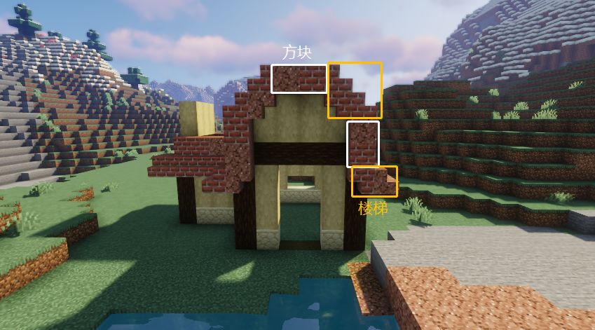 接下来,在如图所示的屋顶位置建造烟囱~所用材料是石砖楼梯和石砖: