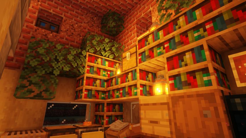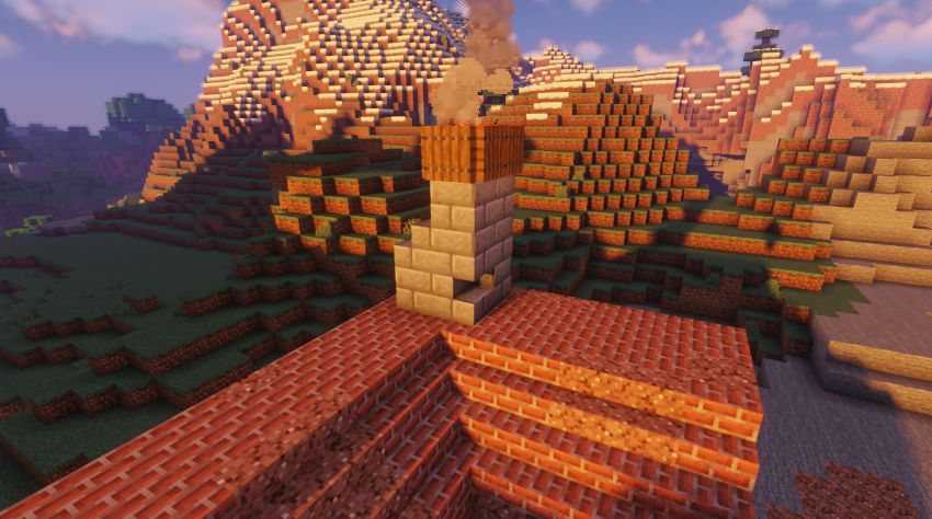 楼梯与石砖交叉摆放,构造不对称感,然后用云杉木活板门和营火制造烟囱顶端: