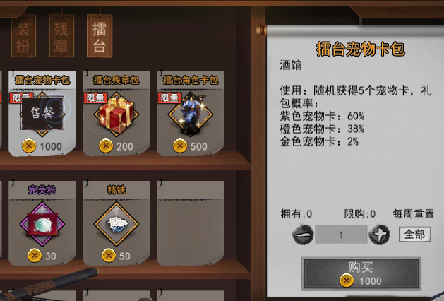 擂台币优先兑换一壶好酒和擂台宠物卡包。