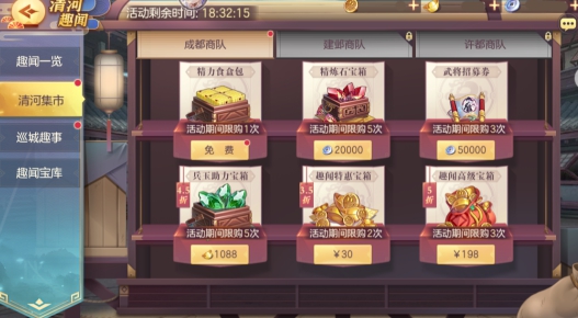 2、可消耗元宝购买含趣闻金币的各类资源宝箱;
