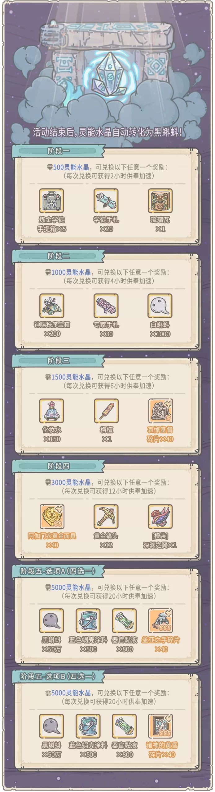 活动期间,每次领取供奉奖励,根据祭品原始的供奉时间,获得活动积分(1小时=1积分)累积对应的活动积分,可获得以上奖励。