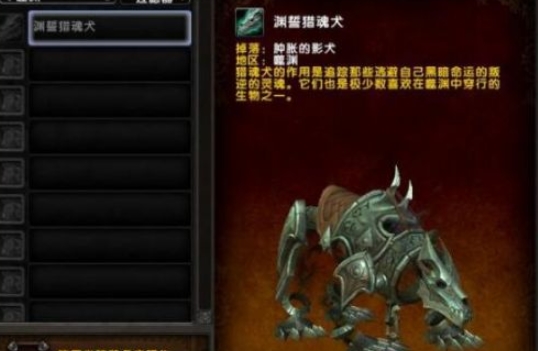 坐骑列表里显示,渊誓猎魂犬掉落于肿胀的影犬。这只怪在噬渊的下半区,野兽密径(55.0:80.0),这是噬渊地图的第三部分,目前还未开放。
