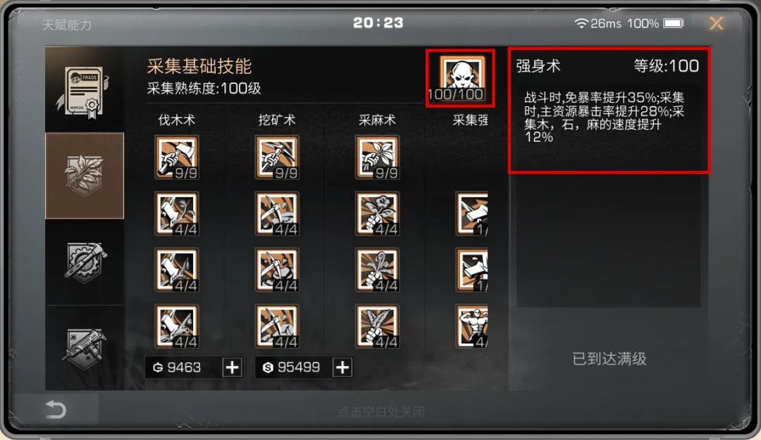随着采集等级的不断提高,强身术天赋让我们在战斗时能够提升一定的免暴率,每提升一级免暴率也会相应提升。建议幸存者们可以将此项天赋点满。