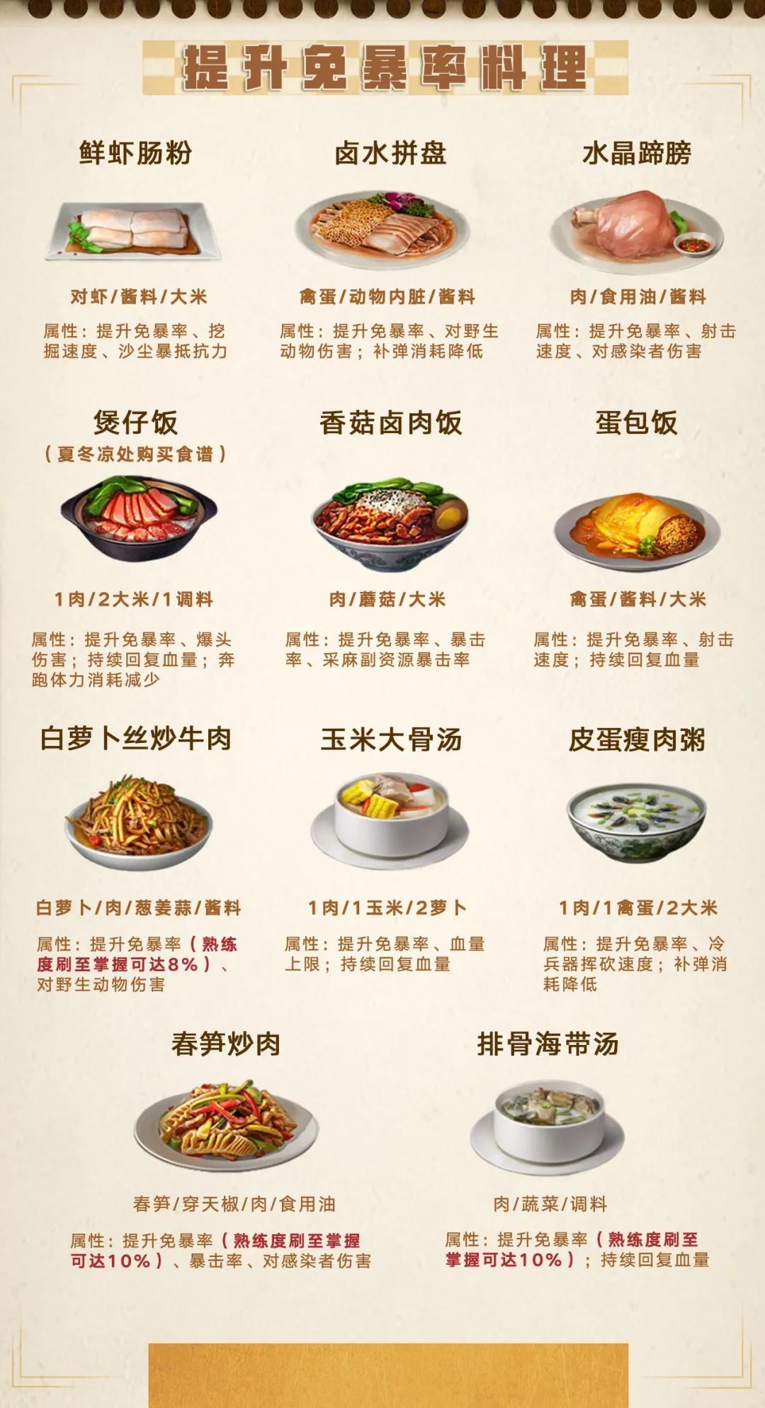 在末世战斗中幸存者可以食用具有免暴率提升属性的料理,下面是目前有关免暴率提升的战斗必备料理!