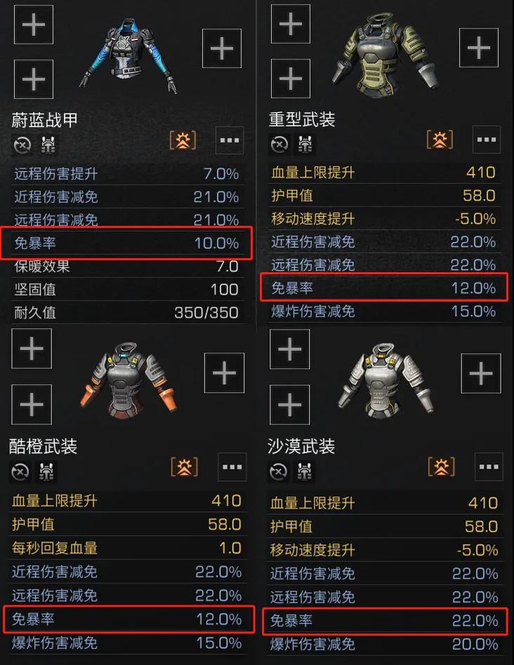 以及重型武装、酷橙武装均自带12%的免暴率基础属性。