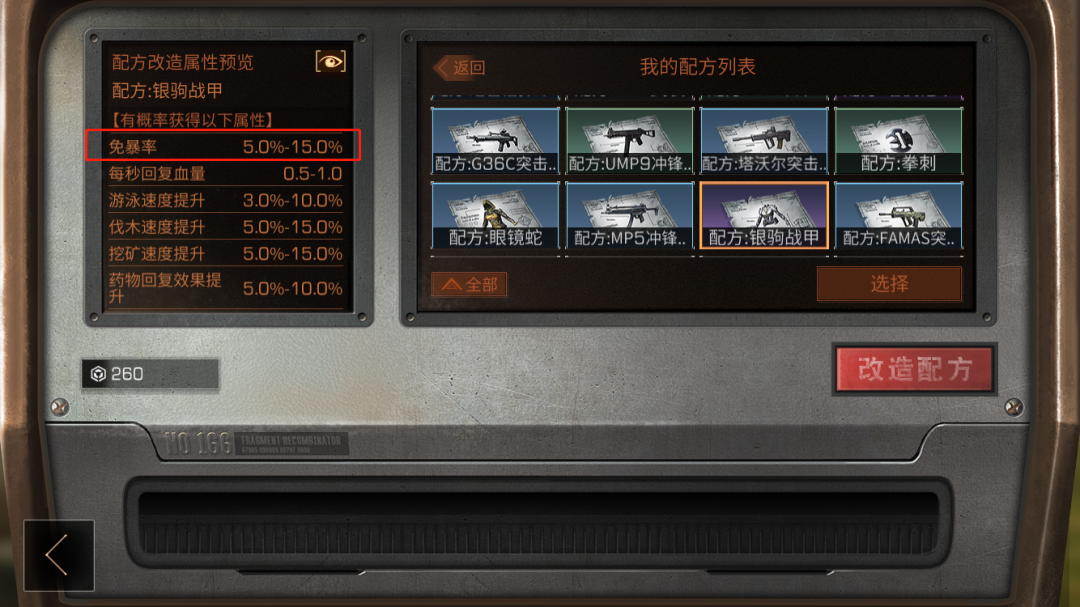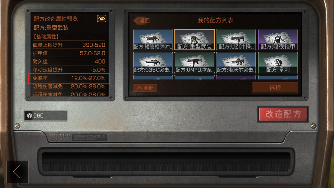同时,其余护甲装备进行配方改造时均有几率额外获得免暴率5%-15%的属性,幸存者们在选择装备时可以优先考虑免暴率高的装备,并搭配具有免暴率属性的头盔,可叠加免暴率属性。