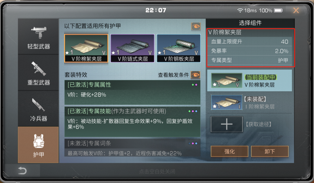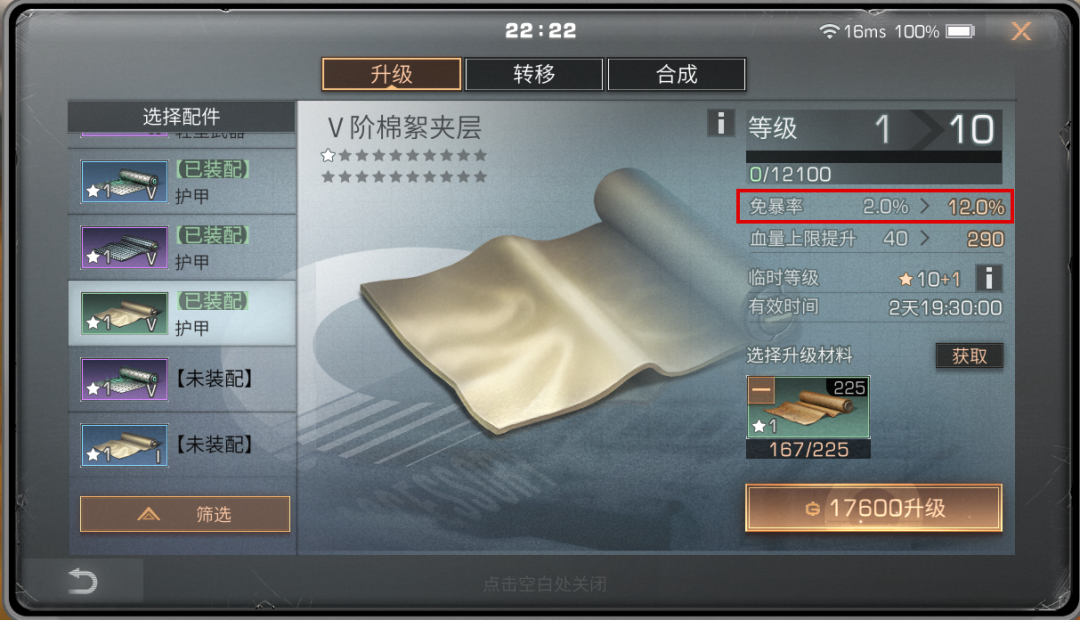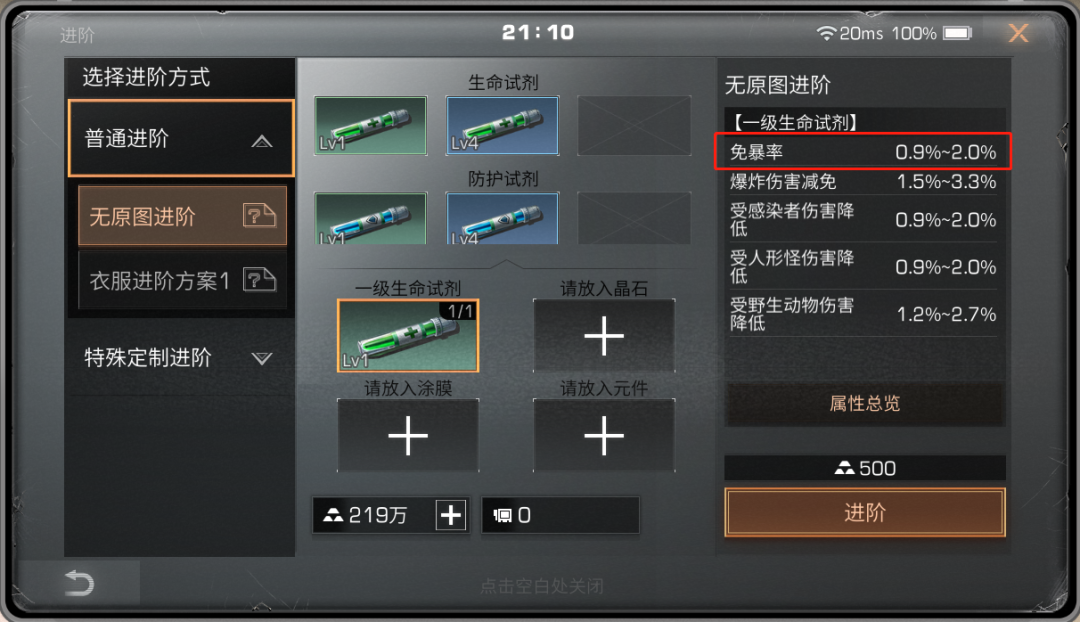 一级棉絮夹层与钢板夹层自带2%的免暴率,幸存者使用护甲材料对配件进行升级时,每各升一级可获得1%的免暴率加成。