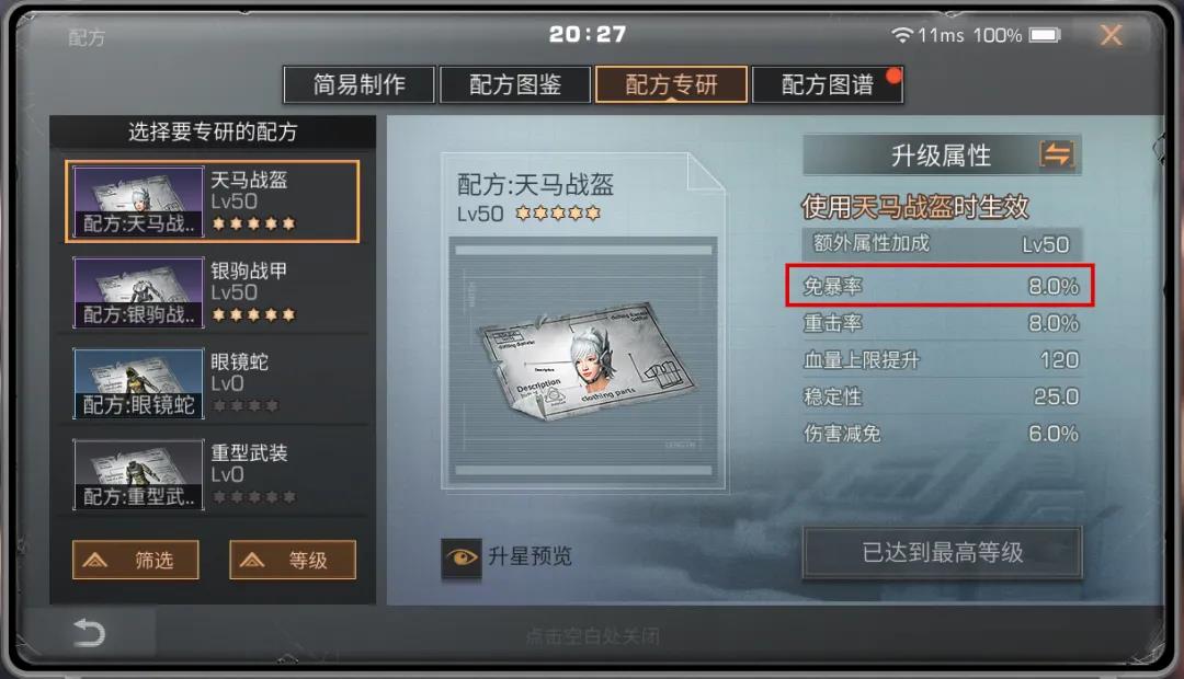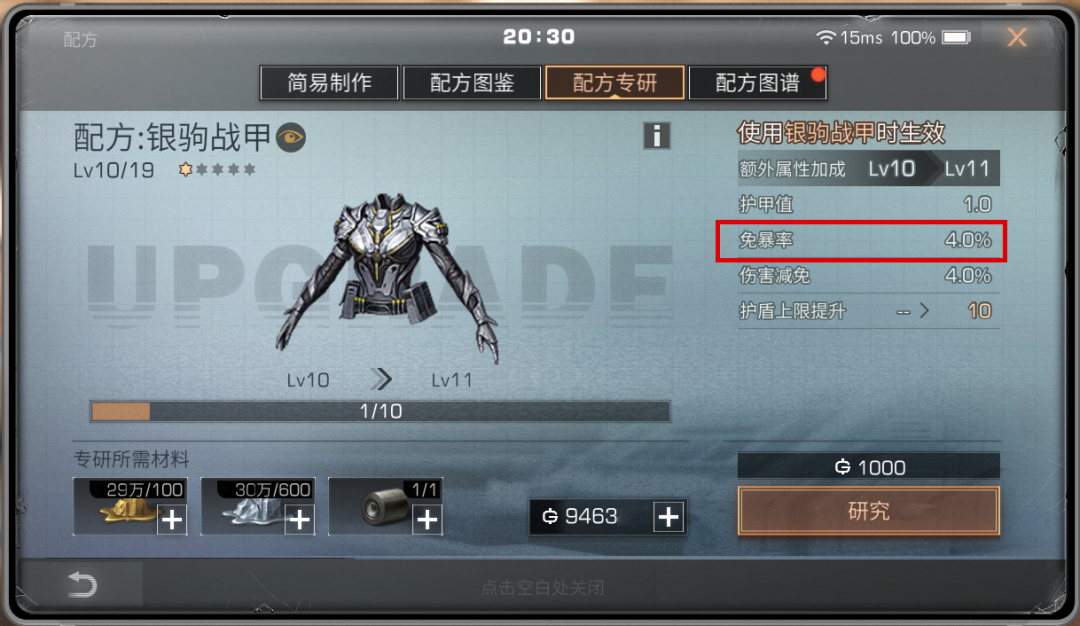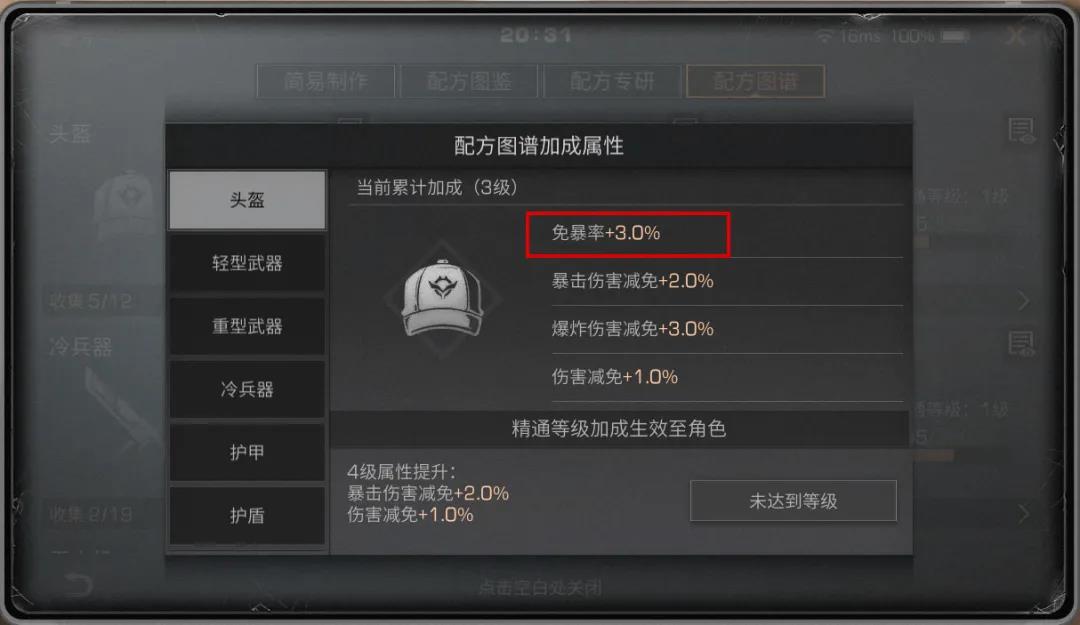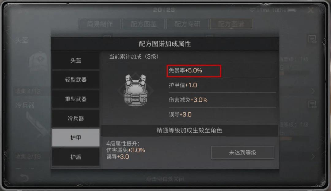 护甲配方升至一星时将有4%的免暴率加成,升至三星有8%免暴率,升至五星可达到12%免暴率加成。
