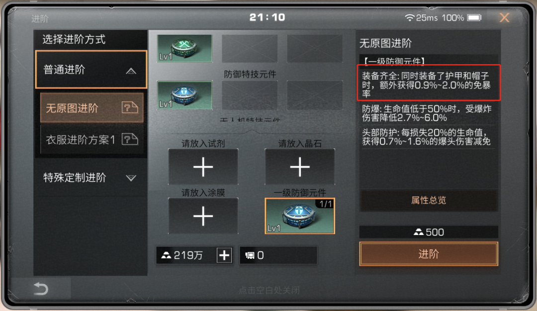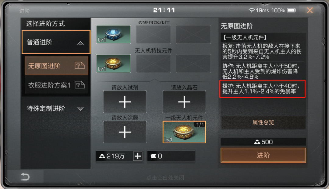 要提升免暴率,还可以选择防御元件和无人机元件。元件等级越高,有几率获得的加成便越高。
