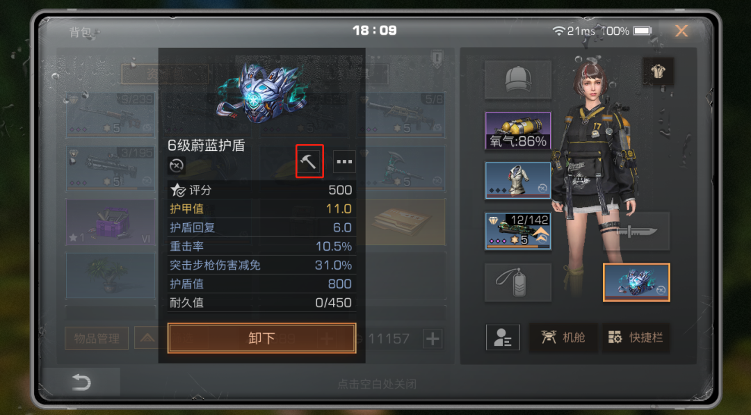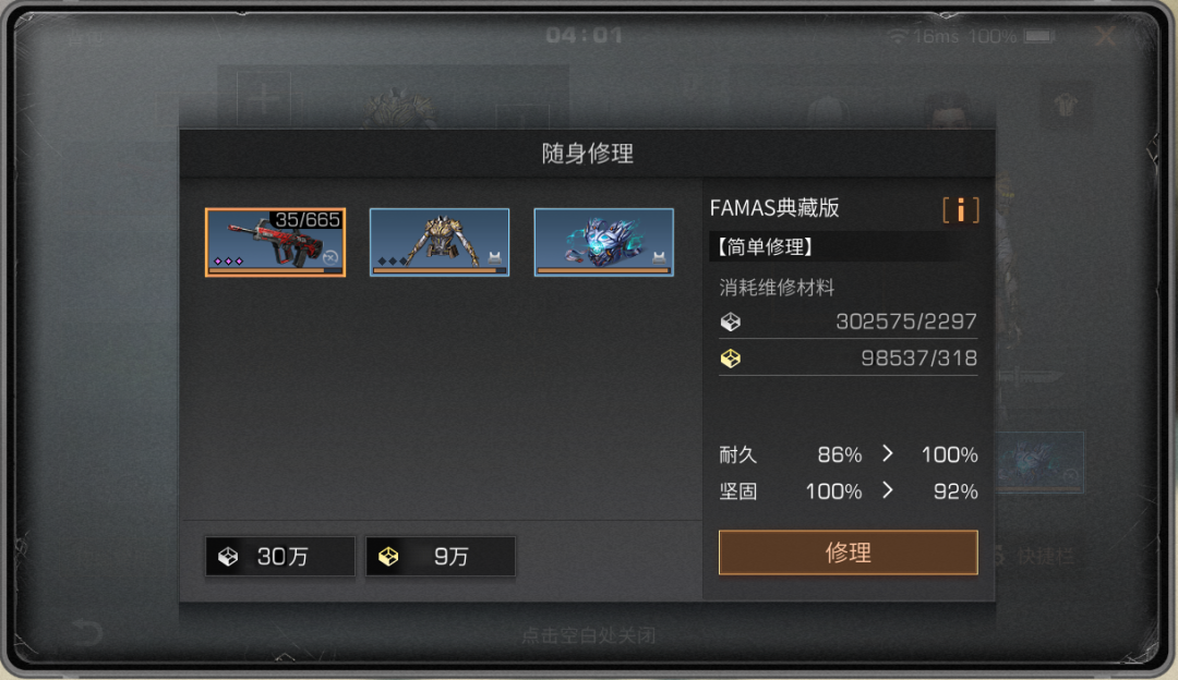 修理台不在身边时,可以消耗纳米塑材,通过背包选择装备,点击修理入口进行随身修理。